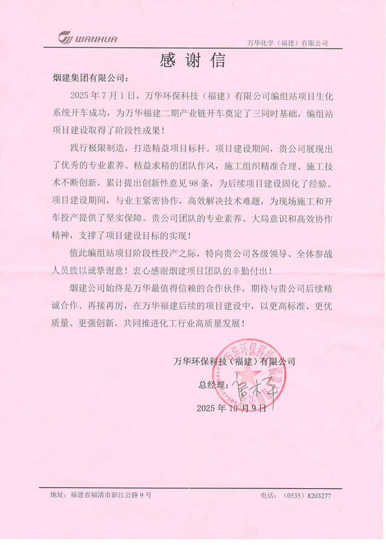 2025年10月9日,十公司收到了万华环保科技(福建)有限公司发来的感谢信