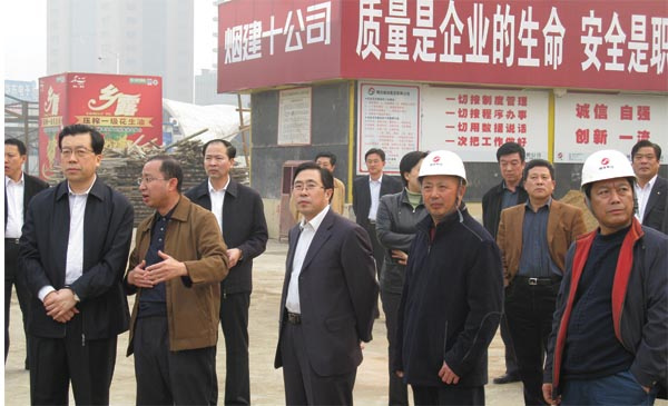 2007年11月,公司总经理姜连喜(右二)陪同烟台市委书记张江汀(左一,时任市长)、时任烟台市建设局局长高庆波(右三)视察公司承建的烟台火车站站房改造工程。